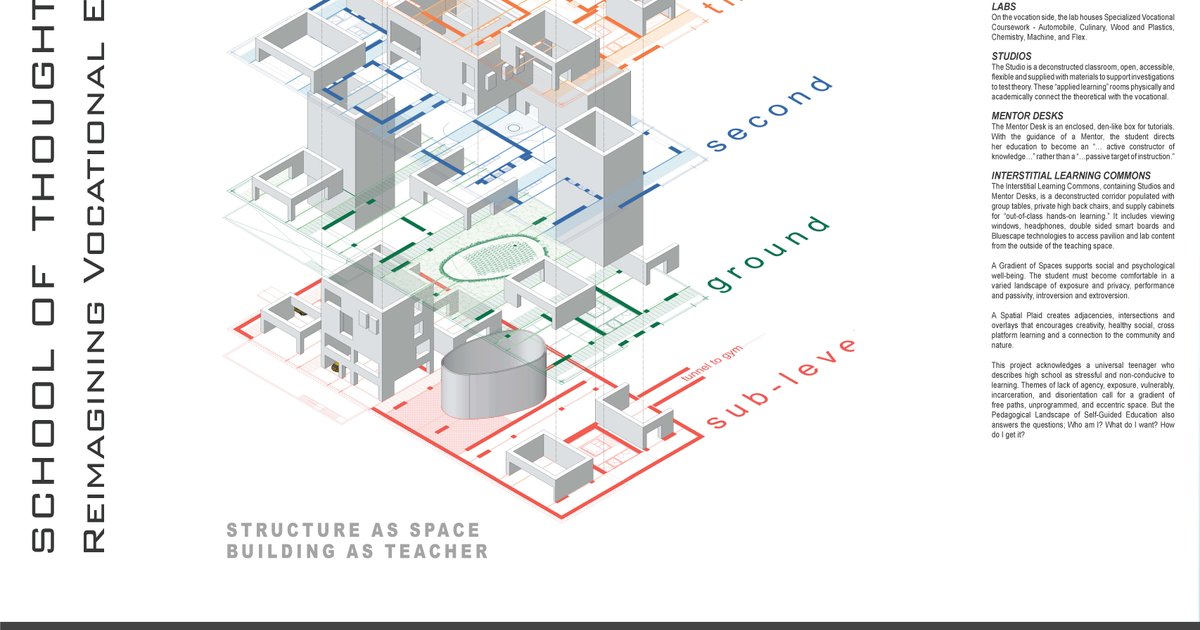 In the Emilio Reggio tradition, the building acts as a “third teacher.” Its structural is a didactic kit of parts that celebrates tectonics and construction. It is organized in 3 major elements; a theoretical bar, a vocational bar with applied learning spaces forming a bridge to connect them. There is also a Pedagogical Gradient of Spaces that organizes
