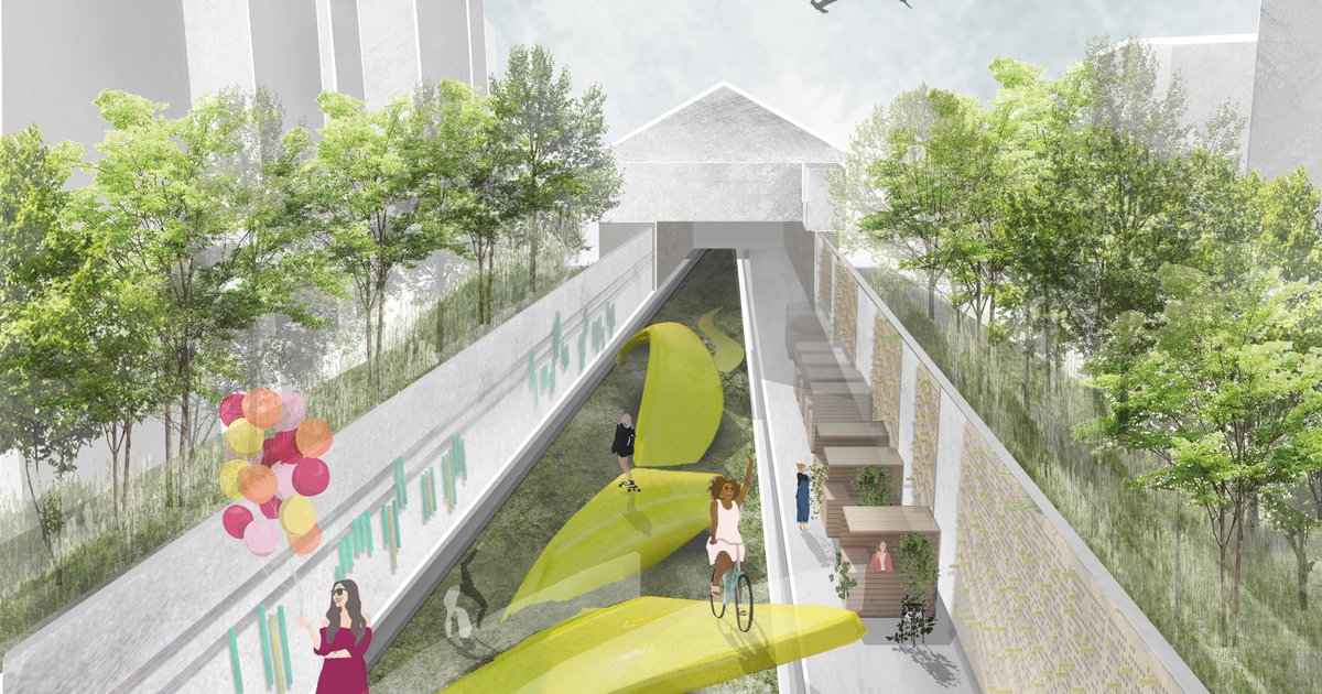 – is inspired with phrase, “path of life”. Which not always is straight and easy but full of fluctuations, rises and falls. Unpredictable. Adaptable. Our main part of project is parametric installation in shape of serpentine. It’s space which brings freedom, hope and happiness. Yellow we associate with freshness, positive energy and optimism.