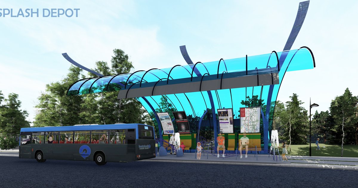 The design for this bus stop is inspired by the fluidity and movement of water. The structure takes shape as a series of undulating extrusions that rise from the ground to create the roof, seating and supporting elements. Interlaced metal strips create spaces for the community to experience water as a play for children to paly, artists to play music, etc.