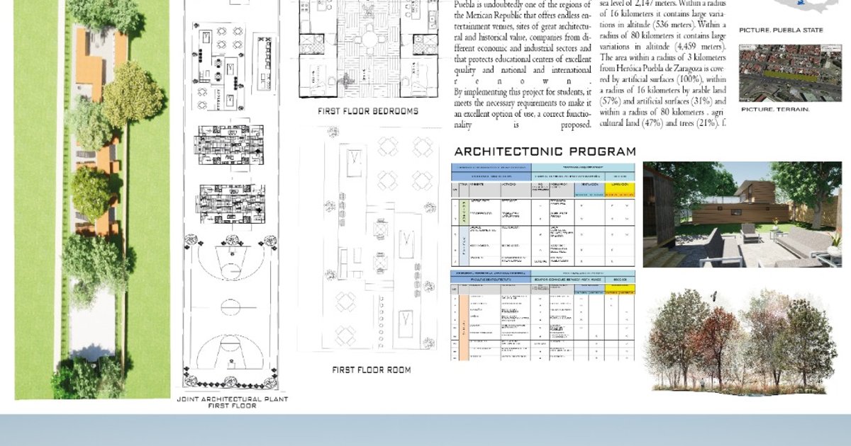 This project was developed in the city of Puebla, thinking about the comfort and convenience of those outstanding students, who do not have an adequate shelter within the city to satisfy the need for a safe and stable home nearby that allows them to function within a student environment appropriate to their needs.