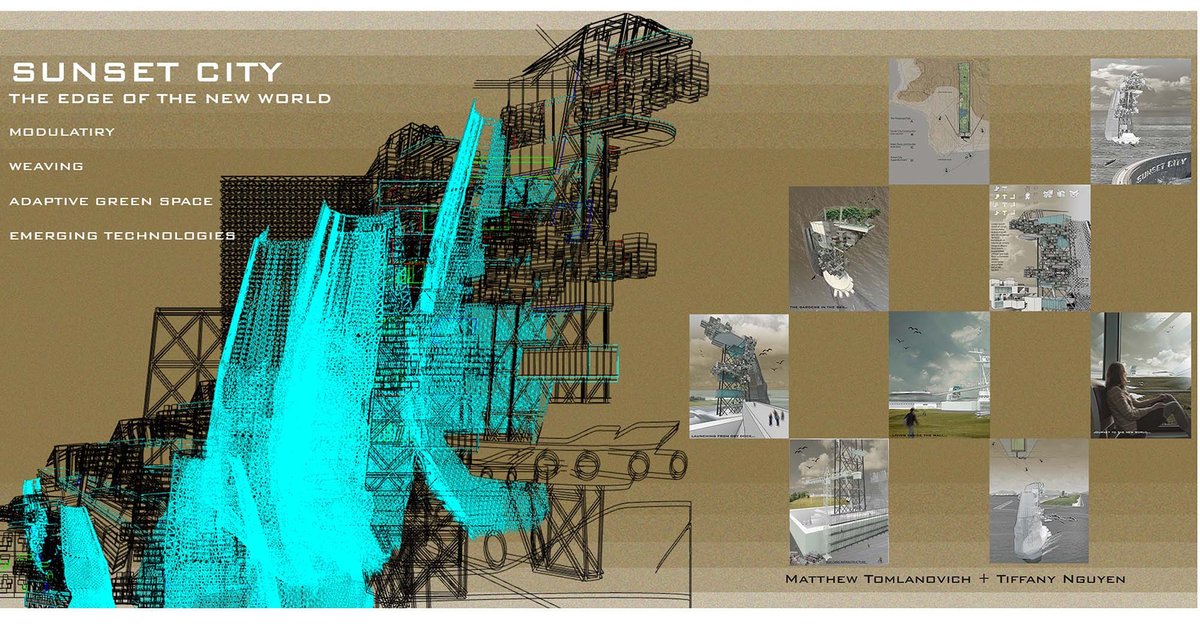 When sea-level rising becomes an issue of the future, solutions need to be made! Sunset City is the edge of the new world, a vision of a new life moved west of the old, now-submerged land, to preserve parks and gardens and create a sustainable way of living that adjusts to the future conditions.