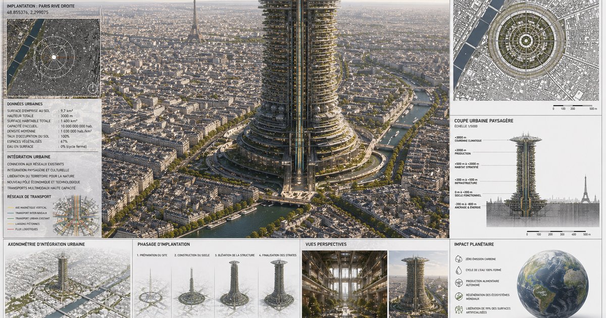 The TERRA VERTICA project develops a radial megastructure located in Paris, articulating a central load-bearing core, an exoskeletal framework, and programmatic rings. This stratified vertical organization integrates dense housing, agricultural production, energy infrastructure, and climate regulation, based on continuous flows and integrated cyclic systems.