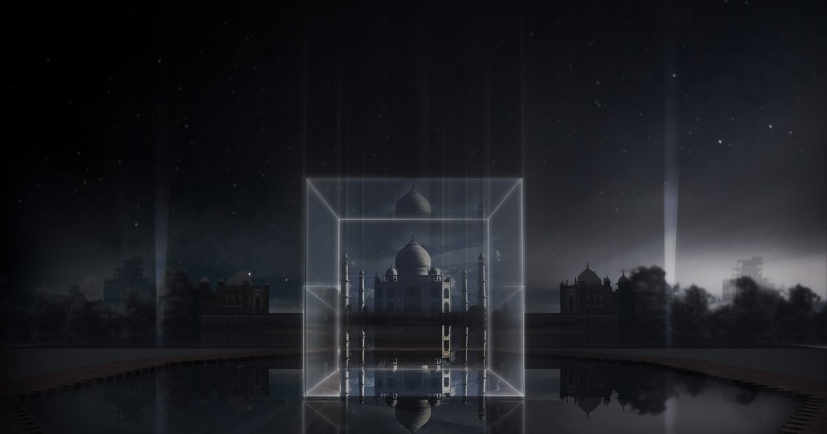 Our design orchestrates a memento for Shah Jahan 'Builder of Marvels' where the most timeless material 'Light' has been used to create different abstractions & ambience of "Black Taj" (through shade, Total internal reflections on all sides of the cube by the materiality of glass) at the core of an optically corrected glass cube...