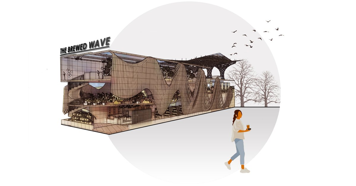 THE BREWED WAVE IS A CAFE WHICH ACTS AS A HUB OF THE MODERN WORLD. THIS IS AN ICONIC BUILDING BECAUSE OF ITS UNIQUE FACADE WAVE FORM.