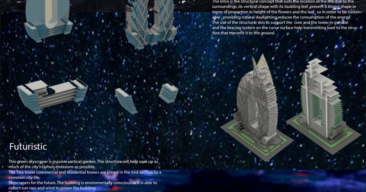 The DUO tower is a futuristic vertical city building planned for 2050. The significance of this skyscraper is to make the life of the human being easier by providing their needs within one vertical city building, a skyscraper that serves as a workplace both a Private and Public.