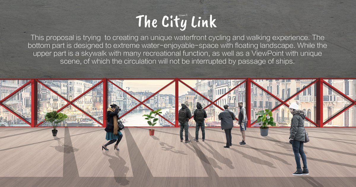 This proposal is trying to creating an unique waterfront cycling and walking experience. The bottom part is designed to extreme water-enjoyable-space with floating landscape. While the upper part is a skywalk with many recreational function, as well as a ViewPoint with unique scene, of which the circulation will not be interrupted by passage of ships.