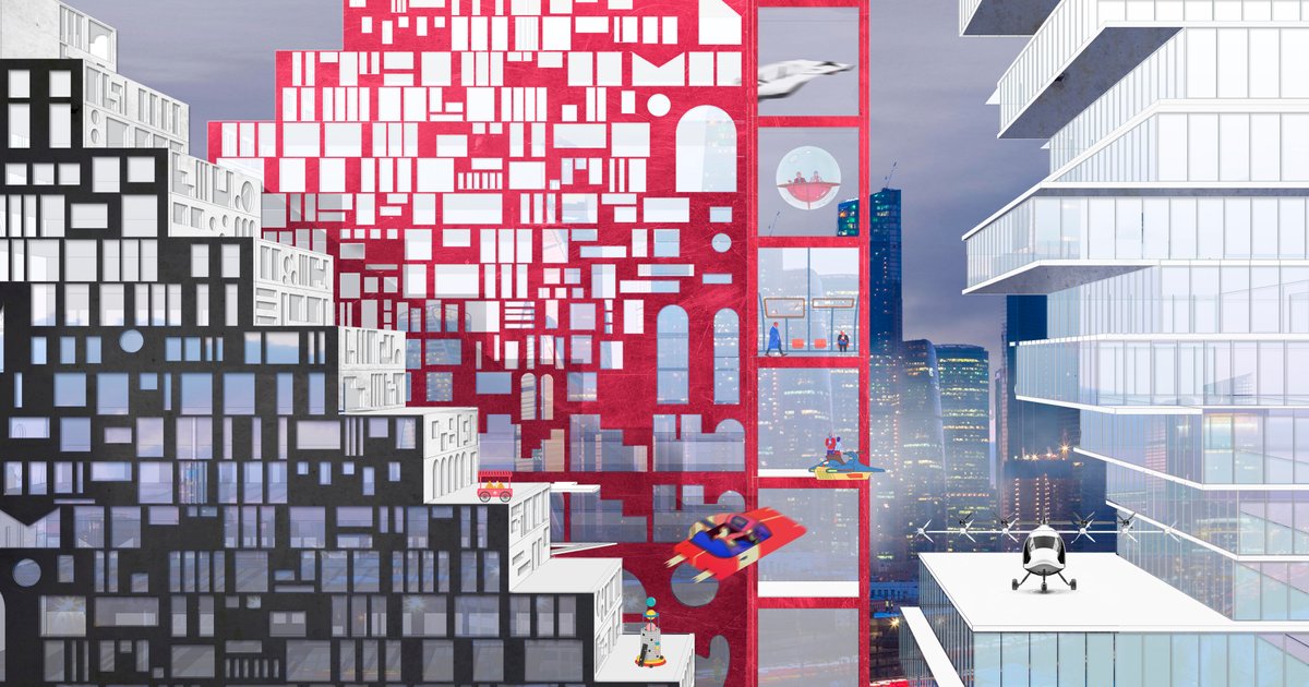 The CityGate is a new high building tipology. This is the stop of the ever-wandering nomads who populate the coliving and the permanent residence of groups of people or singles, the stop of ships and boats, drones and hyperloop, privat flying cars and airplanes. Planes flying to Moscow for the whole world can land on each floor of a skyscraper.