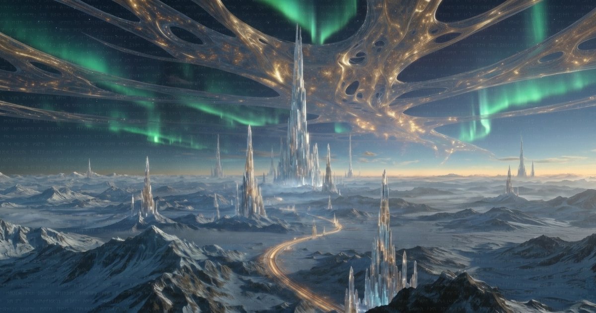 Asgard reimagined as a pre-human civilization where technology became myth. Crystalline structures grown by unknown laws, Yggdrasil as a cosmic infrastructure connecting realms, the Bifrost as a controlled spacetime anomaly. At cold dawn, the incomprehensible reveals itself, ancient systems once seen by humans as gods. Myth as memory. Physics as divinity.