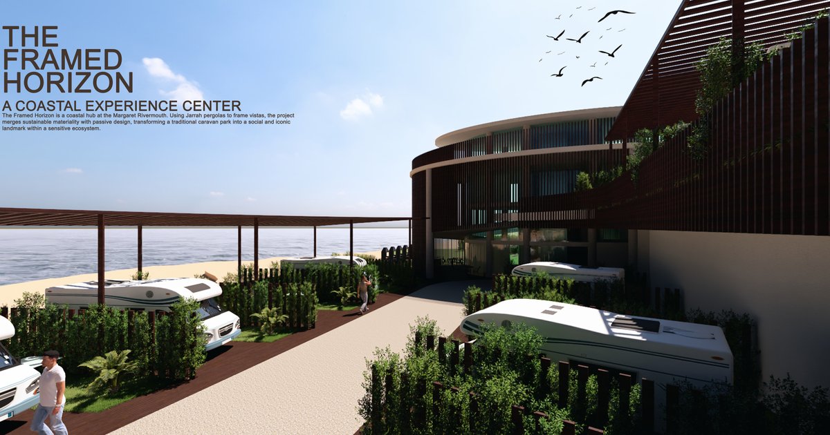 The Framed Horizon is a coastal hub at the Margaret Rivermouth. Using Jarrah pergolas to frame vistas, the project merges sustainable materiality with passive design, transforming a traditional caravan park into a social and iconic landmark within a sensitive ecosystem.