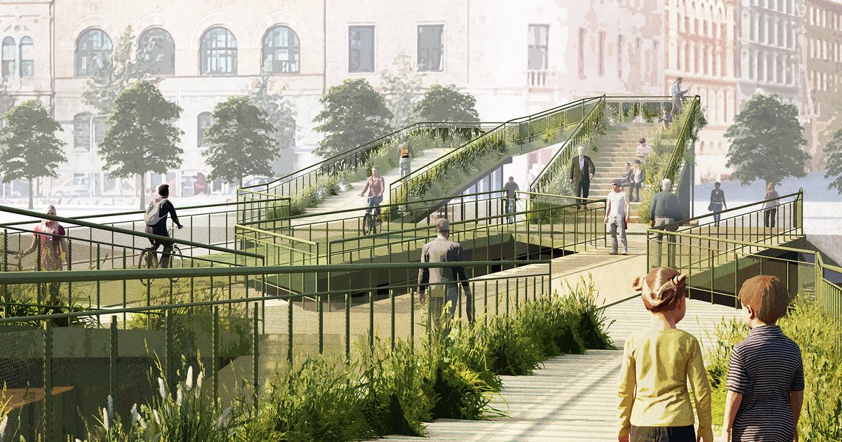 The Green Bridge was created in the way enabling free "flow" of people within different functions and gathering them at different height levels.