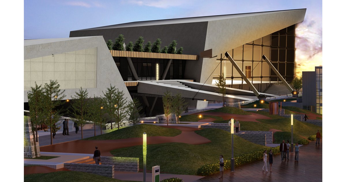 The innovation of design is the suspended bridge between the two different portion of the building.