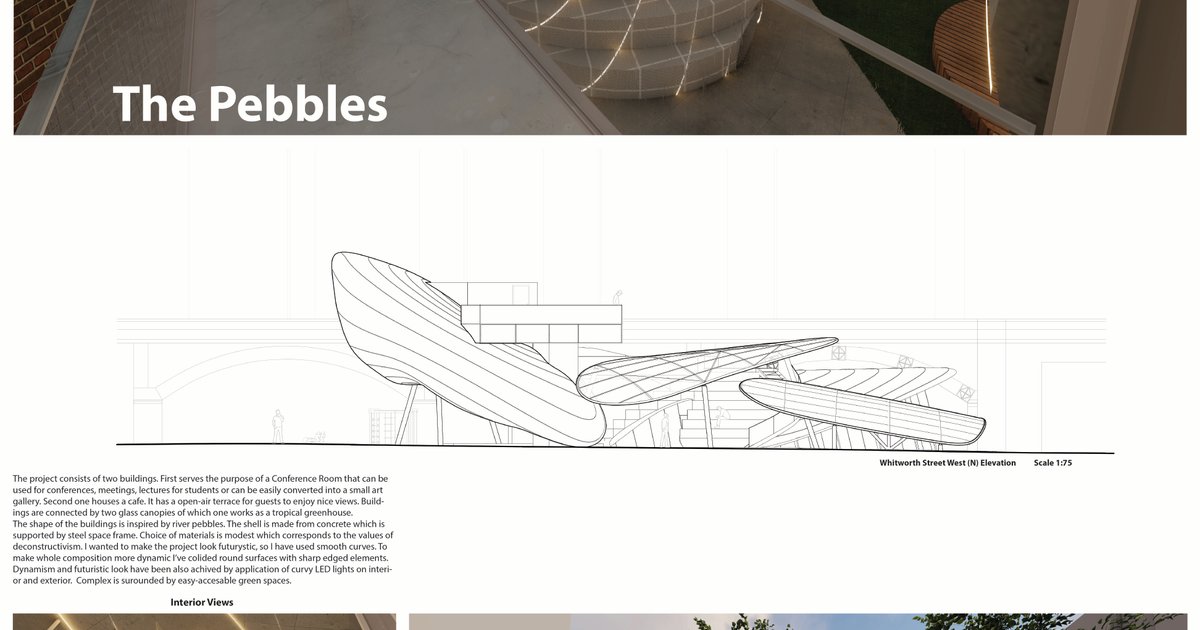 The project uses soft, curvy lines to create an inviting environment. Buildings are inspired by river pebbles which refer to the city's industrial history in which water played a huge role. Their unique shape makes them easily visible in this urban enviroment.