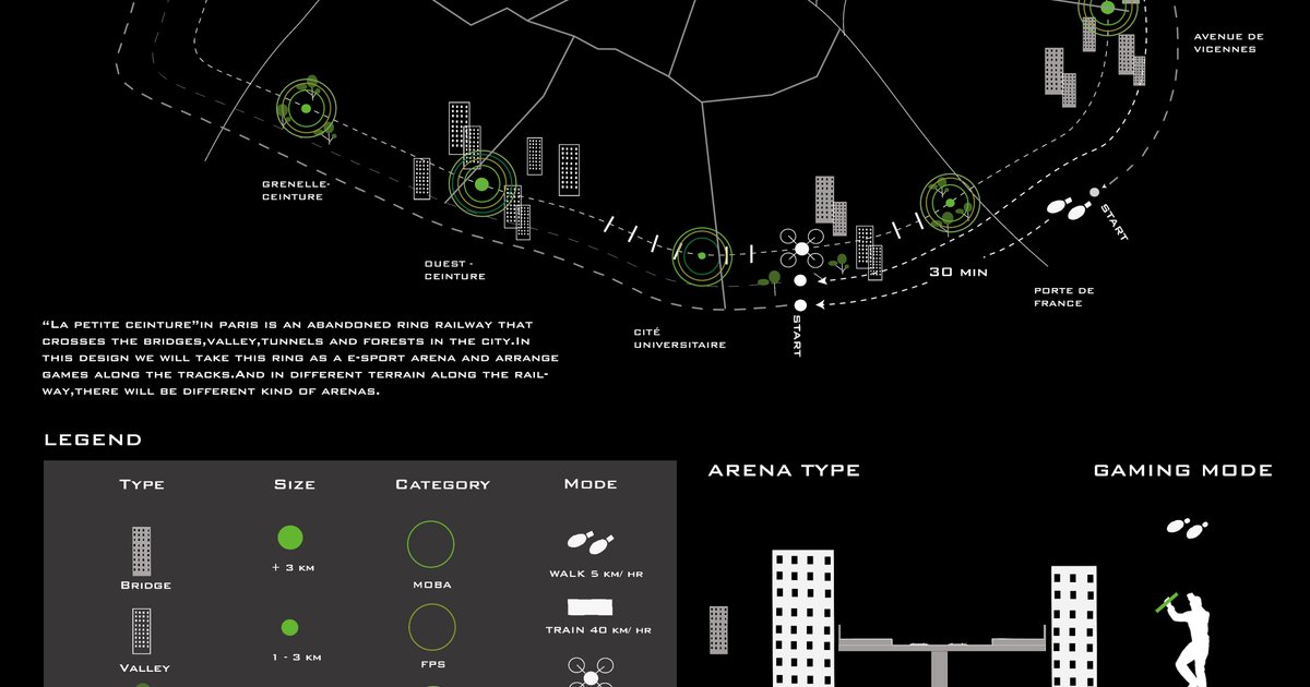 ”Petite Ceinture”is now an abandoned ring railway that crosses the bridges,valley,tunnels and forests in the city. In this design we will take this ring as a e-sport arena and arrange games along the tracks.And in different terrain along the railway,there will be different kind of arenas.