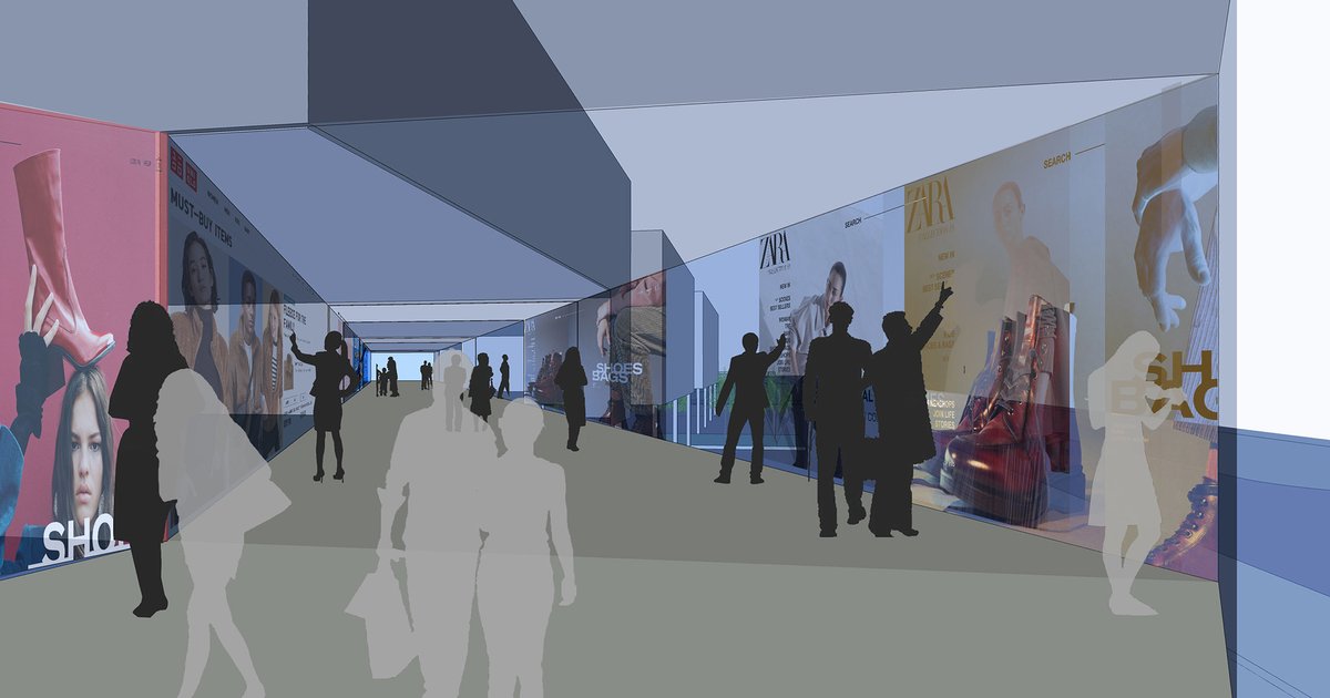 THE WALL is an electronic surface divided into different vendors and operated remotely. It has an unlimited possibility for a CUSTOMIZED shopping experience, selected items are immediately delivered FROM WAREHOUSE below to SHOWROOMS for display and pick up. The WALL CORRIDOR is a forced pedestrian traffic link between buildings providing CONVENIENT shopping