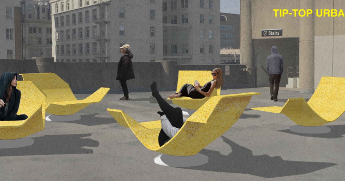 The modular urban furniture collection is open to a variety of interpretations by its users, stimulating them to come up with new ideas for its use. The location of the project is a rooftop of a parking structure in downtown Portland, Oregon. The objects are made of recycled ocean plastic.