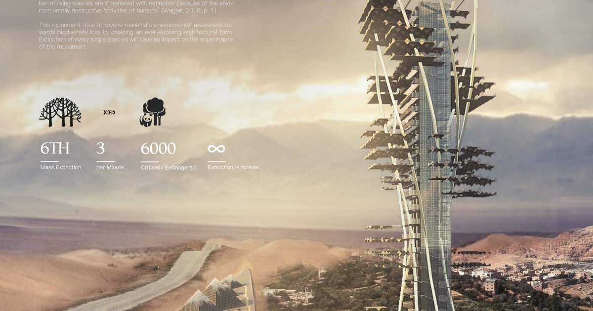 This is a permanantly evolving monument for commemoraion of the 6th mass exitincetion. In this memorial, every single species on the Earth is made into a unique tetrahedron unit. In the first beginning, when none of them is extinct, all the units are attatched to a tower representing life and vitality. Nonetheless, whenever a species becomes extinct, the