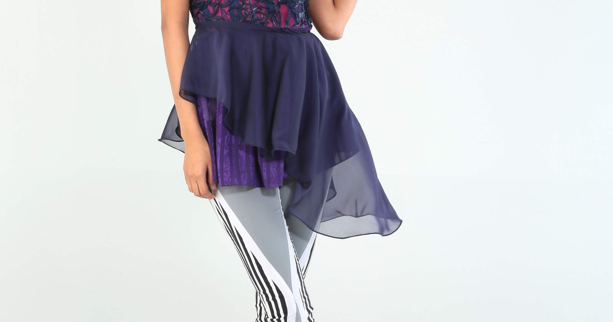 Blouse made in magenta taffeta, navy blue lace and purple and blue chiffon. It combines three different textures and two different patterns (the flowery lace and the striped purple chiffon). It zips up in the back. It has a two-layered skirt and the upper layer can actually be detached so it can be worn as a skirt on its own.