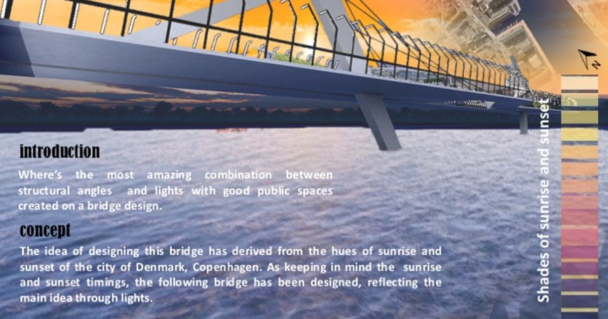 The power of light The idea of designing this bridge has derived from the hues of sunrise and sunset of the city of Denmark, Copenhagen. As keeping in mind the sunrise and sunset timings, the following bridge has been designed, reflecting the main idea through lights.