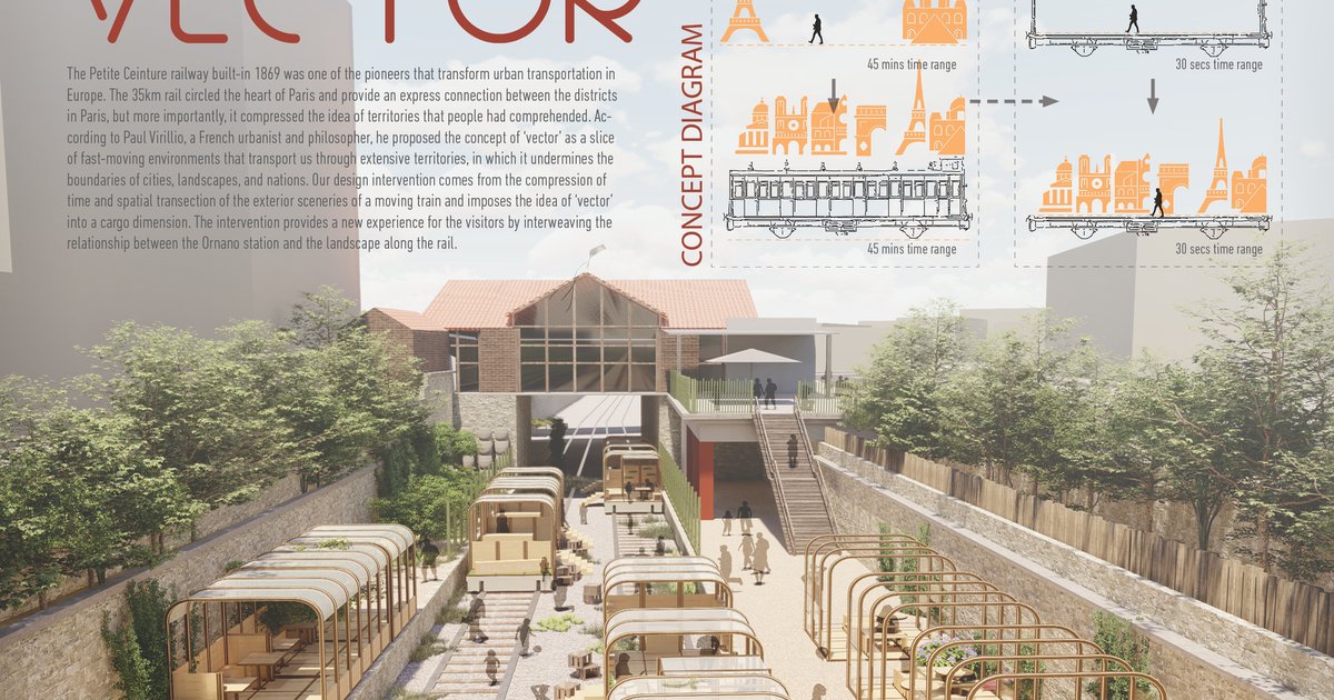 Our design intervention comes from the compression of time and spatial transactions outside the train and imposes the idea of ‘vector’ into a cargo dimension. The new lateral experience for the visitors becomes a remembrance to the historic railway, establishing a new relationship between the Ornano station and the landscape along the rail.