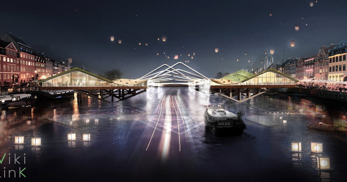 A bridge with green hills representing Denmark in its historical and modern age inspired by the country's roots in Vikings.