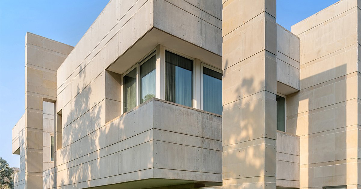 The Lakhani Villa, in Ahmedabad, embodies the concept of ‘Tranquil Modernism’, blending timeless contemporary design principles with serene, nature-integrated living spaces. With an aesthetic featuring a clean geometry and uncluttered spaces, it provides a sanctuary from the urban chaos. The beige and white sandstone and exposed architectural concrete, complements the minimalist design. Expansive shaded glazing, spacious balconies, and landscaped courtyards and lawns integrate the indoor and outdoor spaces, fostering a profound sense of harmony with nature. An expansive entrance plaza, covered by a sweeping canopy welcomes visitors with grandeur. A linear wall, punctuated with strategic openings, shields the garden from view, creating an intriguing visual element. The linear double-height vestibule that leads into the home serves to divide the public and private areas, its starkness artfully interrupted by interesting murals, adding artistic flair. Inside, the living and dining areas open into a large garden through floor-to-ceiling glazing system, enhancing the indoor-outdoor connection. The interiors echo the villa's modern ethos. Clean lines, neutral tones, and an open floor plan define the living spaces, creating an atmosphere of serenity and spaciousness. Natural materials like wood and stone add warmth and character to the décor, with an absence of clutter emphasizing functionality. The interior features Italian marble flooring and minimalist furniture, with aesthetic pieces of art imparting splashes of colour to the simple white walls. Signature light fixtures add character and elegance. The living room furniture, with bold black upholstery brightened by colourful throws and cushions, creates a striking yet inviting space. Expansive windows frame the garden, allowing natural light to flood the interior. The expansive patio, equipped with comfortable outdoor furniture, invites al fresco dining and leisurely gatherings, while a pool at the back of the house, provides a space for relaxation and recreation. Environmental sustainability is a guiding principle throughout the villa's design and construction. Use of cavity walls, eco-friendly materials and energy-efficient systems such as solar panels and LED lighting, minimize the environmental impact. Native plants, simple hardscaping, and towering trees harmonize with the villa's architecture, creating a verdant oasis that requires minimal maintenance. Existing trees on the site have been accommodated through a cut-out in the slab of the first-floor terrace, integrating Nature within the architectural framework. The aesthetic of the Lakhani Villa masterfully combines the robust, stark geometry of brutalist architecture with an unexpected airiness and lightness. The design incorporates bold, unadorned materials like concrete and sandstone, creating a raw and powerful presence, counterbalanced by expansive windows, open spaces, and design elements that allow natural light to flood the interior. This juxtaposition of heavy, solid forms with light-filled, open spaces results in a unique and harmonious living environment that feels both substantial and uplifting.