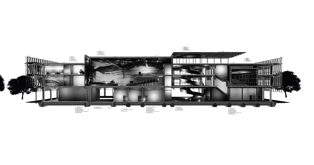 Section through the music school building – a stratification of structural, thermal and acoustic layers, developed within a parametric design workflow to optimize comfort, energy efficiency and sound insulation.