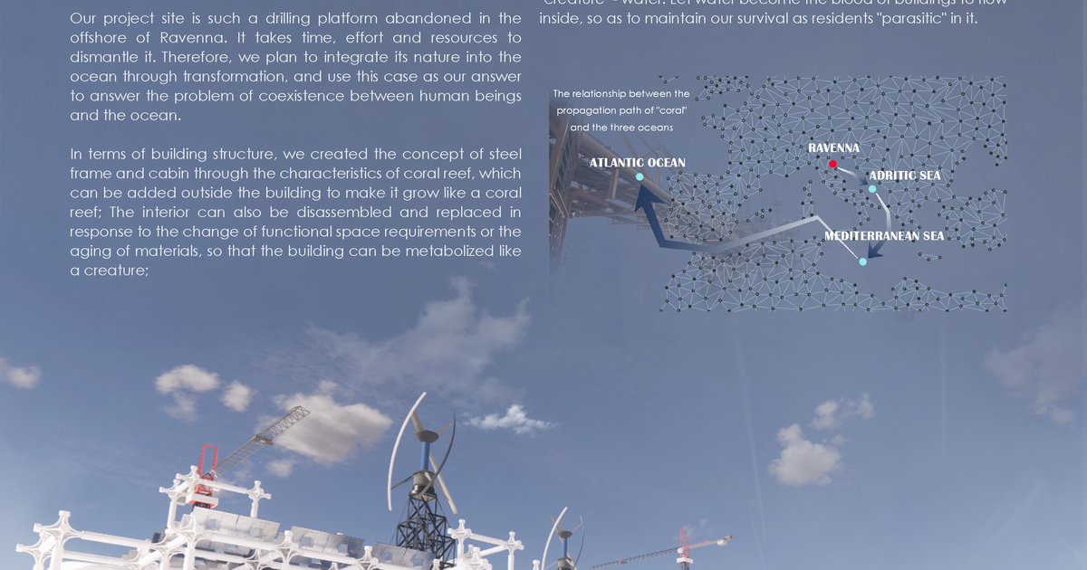In recent centuries, with the rapid development of human industry, the industrial wastes such as wastewater and exhaust gas discharged from it are continuously polluting and eroding the ecological environment of the earth's land and sea. Since 1959, Italy has established nearly 200 offshore oil drilling platforms on the ground and offshore. When the oil and gas resources under the drilling are exhausted, these platforms that cannot be removed are also abandoned. Our project site is such a drilling platform abandoned in the offshore of Ravenna. It takes time, effort and resources to dismantle it. Therefore, we plan to integrate its nature into the ocean through transformation, and use this case as our answer to answer the problem of coexistence between human beings and the ocean. A marine organism inspired us during the research. Coral polyps, as the earliest group of residents on the earth, have multiplied so far. They are model residents living in harmony with the sea. Coral reefs formed by their remains play an important role in the marine ecology. The museum reconstructed from the offshore drilling platform that we designed this time is like a coral reef on the sea, providing a place for human beings to live in the sea, which has been neglected for a long time. In terms of building structure, we created the concept of steel frame and cabin through the characteristics of coral reef, which can be added outside the building to make it grow like a coral reef; The interior can also be disassembled and replaced in response to the change of functional space requirements or the aging of materials, so that the building can be metabolized like a creature; The gap between the cabin and the steel column allows the cabin to be smoothly separated from the steel frame. When an emergency such as tsunami and typhoon occurs, the cabin can be separated from the building and float on the sea to protect the internal life. The water purification circulation and transportation system interspersed in the building is displayed in front of visitors with some exposed transparent pipes. These system pipes cover the whole building, like blood vessels, carrying the blood of this huge "creature" - water. Let water become the blood of buildings to flow inside, so as to maintain our survival as residents "parasitic" in it. As for the energy structure, we have installed a large number of small-scale wind power generation devices on the steel column and the original tower crane of the building, which can provide a large amount of power for the building in combination with the rich local wind energy resources; The top of the outermost cabin is equipped with solar photovoltaic panels. The ocean is less sheltered by urban buildings or plants, so the storage of solar energy will be relatively easy. This human coral reef provides a new possibility for the relationship between human beings and the sea. Humans who walk on the earth return to the sea and live here like marine creatures. Whether local residents, researchers or foreign refugees can find a place to live in this coral reef. The meaning of the end and continuation of life represented by coral reefs is also interpreted by nature in the metabolism of the architecture itself and the departure and retention of internal personnel. One day, when this transformation form of "coral reef" moves from the Adriatic Sea where it grows to the Mediterranean Sea or even the distant Atlantic Ocean, these lights, which are reborn from abandoned drilling platforms into beacons of life on the sea, will eventually become a sea hope road leading to the harmonious coexistence of human beings and the sea .